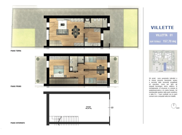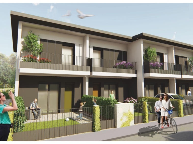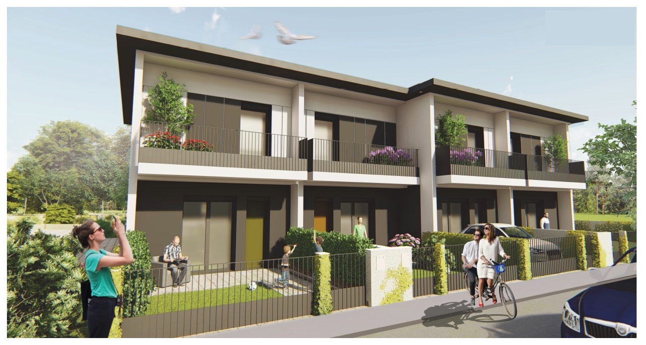 in elegante complesso residenziale composto da 2 palazzine e 3 villette a schiera, circondate da area esterne in parte condominiale in parte dedicato ad un comodo parcheggio ad uso comune si propone in vendita una Casa a Schiera, capofila, suddivisa in zona giorno al piano terra con soggiorno, cucina separata, bagno, loggia e giardino privato mentre al 1° piano si trova la zona notte composta da 3 camere (matrimoniale e due singole), bagno e balconi, nella vendita é compreso anche un garage al piano interrato collegato internamente.