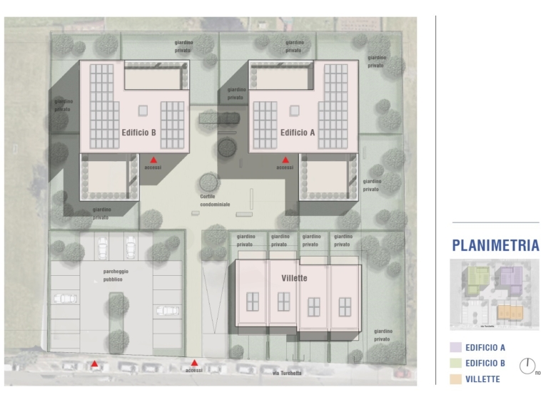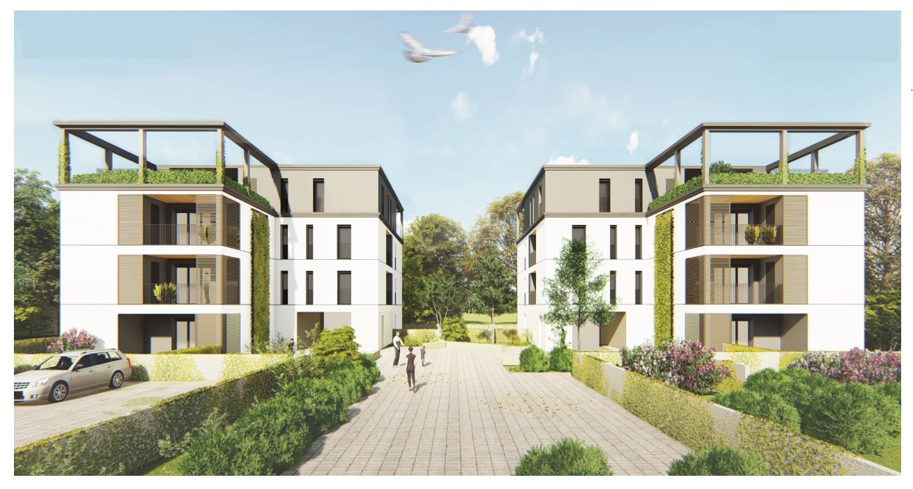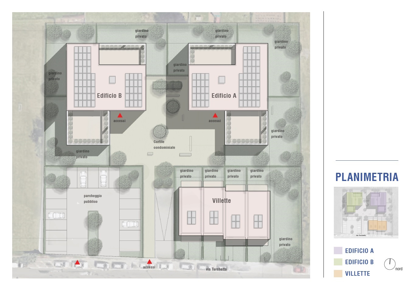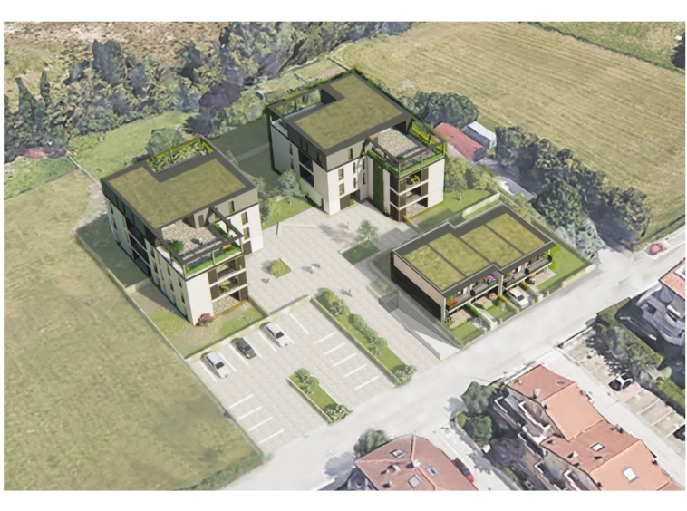 Il piano terra è dedicato ad appartamenti con due o tre camere e ampi giardini, mentre ai piani superiori verranno edificati appartamenti di diversa metratura con balconi in parte loggiati.