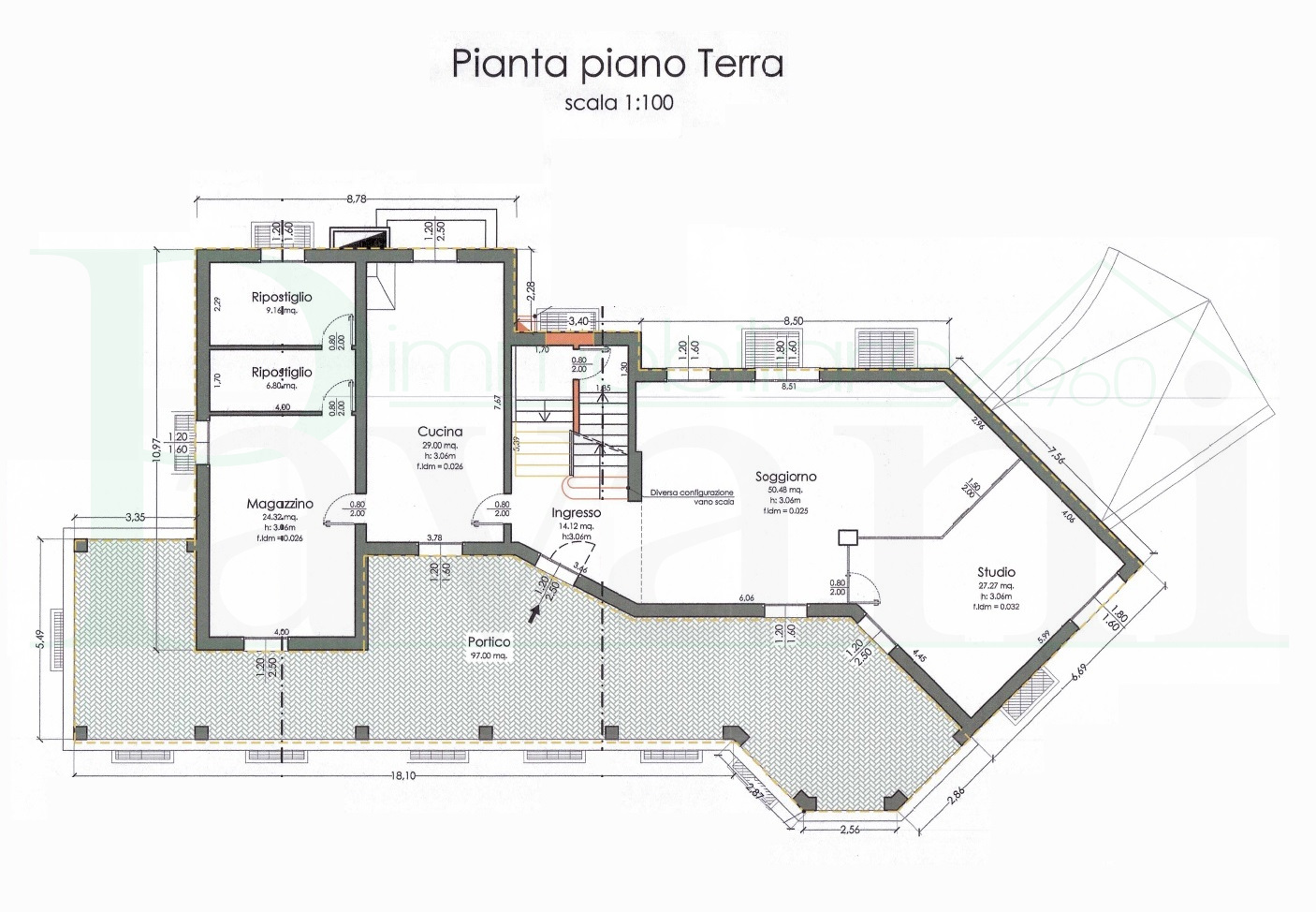Al piano terra, troverai un ampio salone con cucina abitabile, uno studio, un bagno, una lavanderia, una camera per gli ospiti e un portico di circa 97 mq, perfetto per vivere all’aperto e godersi il panorama.